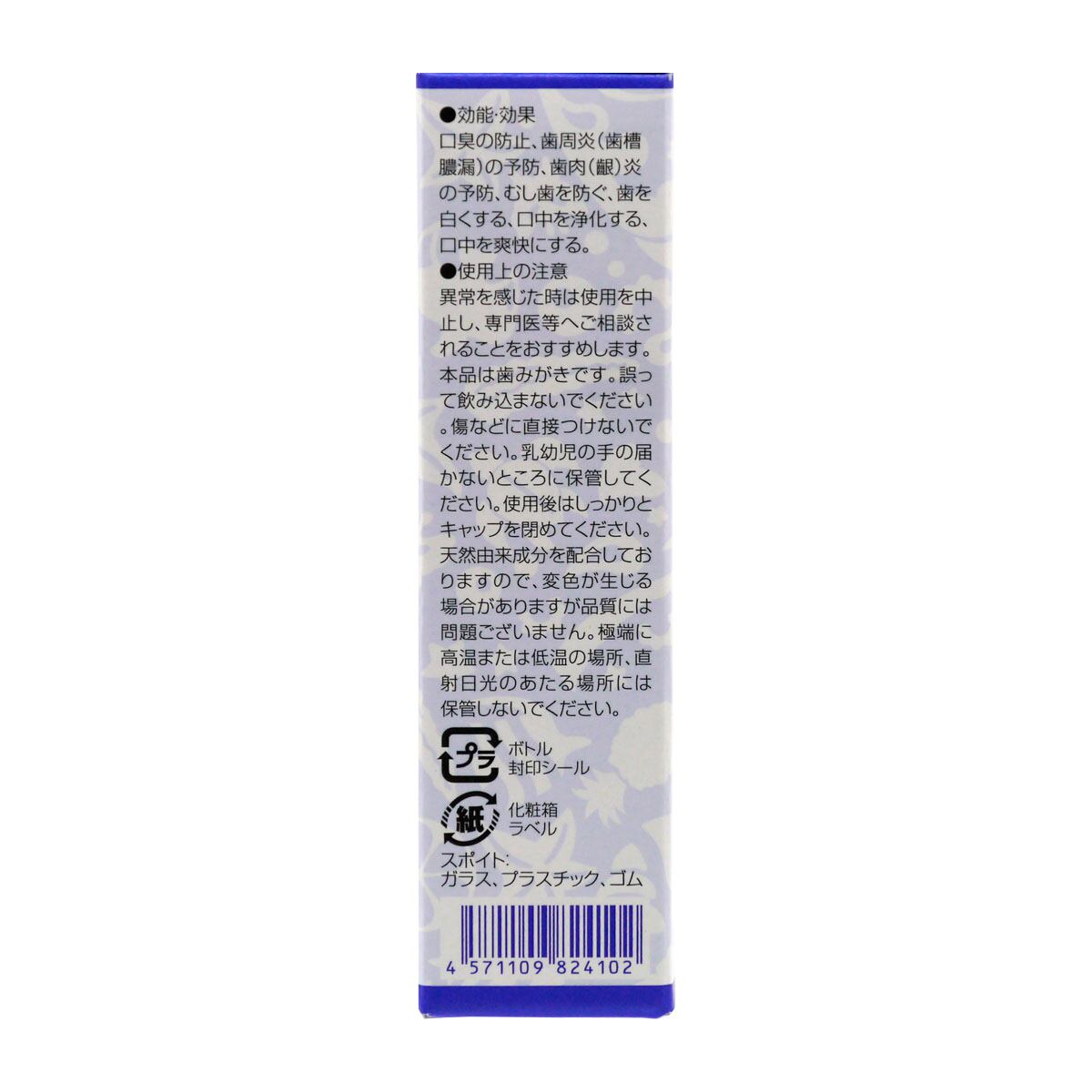 【基剤】精製水 【湿潤剤】濃グリセリン、オウゴンエキス、シャクヤクエキス、レモンエキス、1.3-ブチレングリコール、DL-リンゴ酸、アスコルビン酸、ポリアスパラギン酸ナトリウム液、ウーロン茶エキス、茶エキス(1)、ホップエキス【清涼剤】エタノール、l-メントール、無水エタノール【pH調整剤】無水クエン酸、メタリン酸ナトリウム【粘度調整剤】キサンタンガム、カルボキシメチルセルロースナトリウム【可溶化剤】ポリオキシエチレン硬化ヒマシ油【矯味剤】ステビアエキス、キシリット【着香剤】香料(スペアミント)【保存剤】安息香酸ナトリウム【薬用成分】アラントイン、イソプロピルメチルフェノール【安定剤】天然ビタミンE【着色剤】青色1号