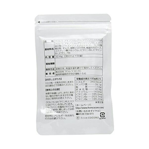 クロレラ、アキノワスレグサ(クワンソウ)、ヒハツ抽出物(デキストリン、ヒハツエキス)、ラフマ葉抽出物、ギャバ、金時ショウガ末/結晶セルロース、ステアリン酸カルシウム、ビタミンB2、ビタミンB1、ビタミンB6