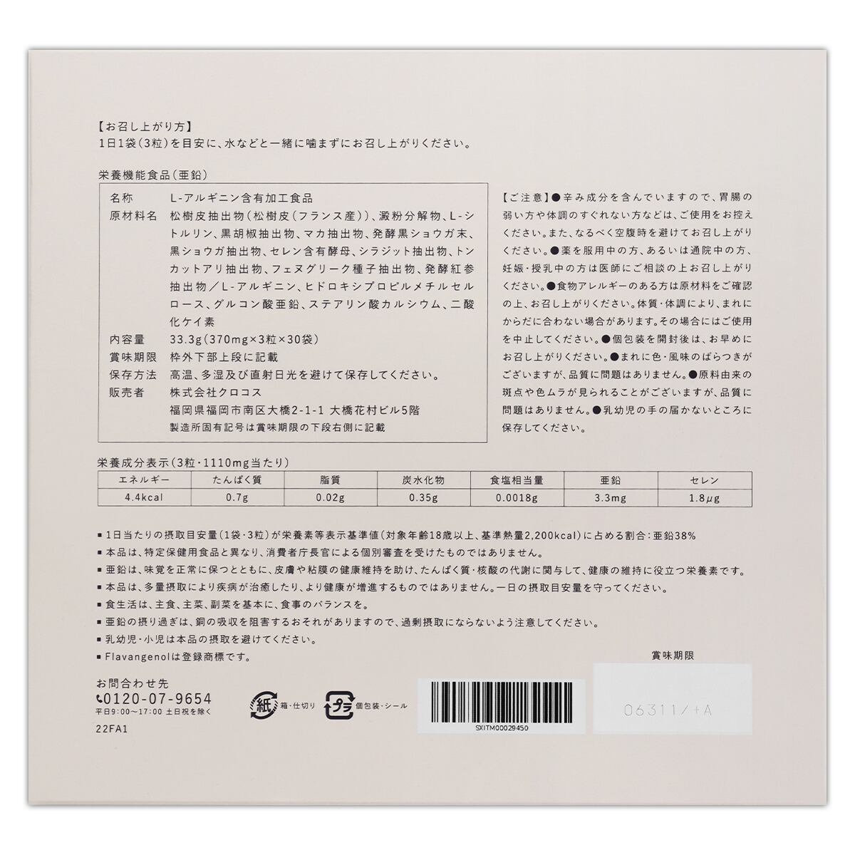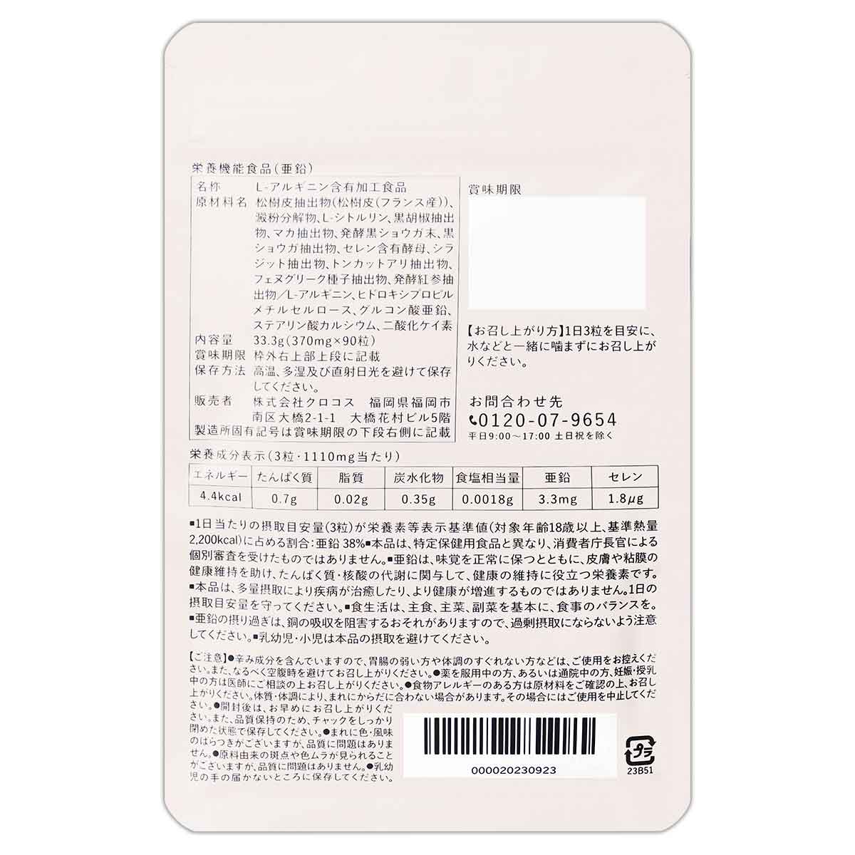 松樹皮抽出物(松樹皮(フランス産))、澱粉分解物、L-シトルリン、黒胡椒抽出物、マカ抽出物、発酵黒ショウガ末、黒ショウガ抽出物、セレン含有酵母、シラジット抽出物、トンカットアリ抽出物、フェヌグリーク種子抽出物、発酵紅参抽出物/L-アルギニン、ヒドロキシプロピルメチルセルロース、グルコン酸亜鉛、ステアリン酸カルシウム、二酸化ケイ素