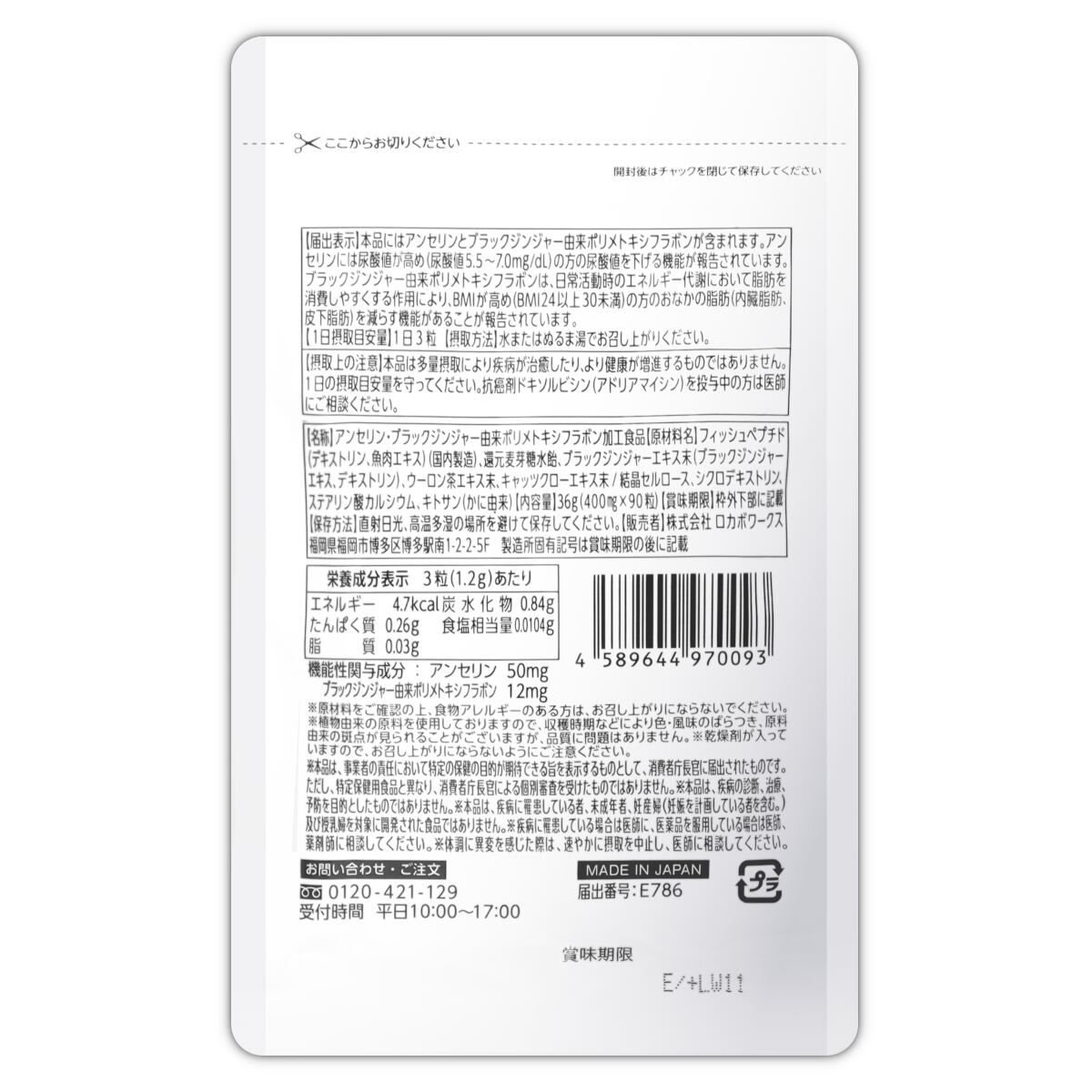 本品にはアンセリンとブラックジンジャー由来ポリメトキシフラボンが含まれます。アンセリンには尿酸値が高め(尿酸値5.5〜7.0mg/dl)の方の尿酸値を下げる機能が報告されています。ブラックジンジャー由来ポリメトキシフラボンは、日常活動時のエネルギー代謝において脂肪を消費しやすくする作用により、BMIが高め(BMI24以上30未満)の方のおなかの脂肪(内臓脂肪、皮下脂肪)を減らす機能があることが報告されています。