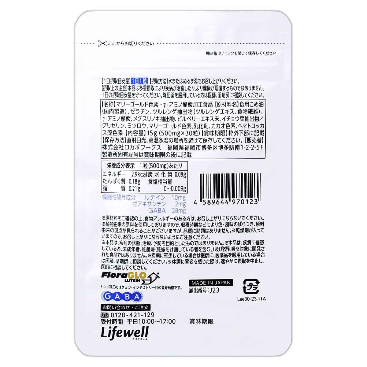 本品には、ルテイン・ゼアキサンチン・GABAが含まれます。ルテイン・ゼアキサンチンには、色のコントラスト感度(ぼやけかすみの緩和により、くっきりとものを識別する力)を改善すること、光刺激からの回復(まぶしい光を受けた後に視機能が戻るまでの時間)を改善すること、年齢とともに減少するブルーライトなどの光刺激から目を守る網膜の黄斑色素を増やすことが報告されています。また、年齢とともに低下する認知機能の一部である判断力(変化する状況に応じて適切に対処したり、推論したりする能力)、注意力(一つのことに集中したり、複数の物事に注意を向けられる能力)を維持することが報告されています。