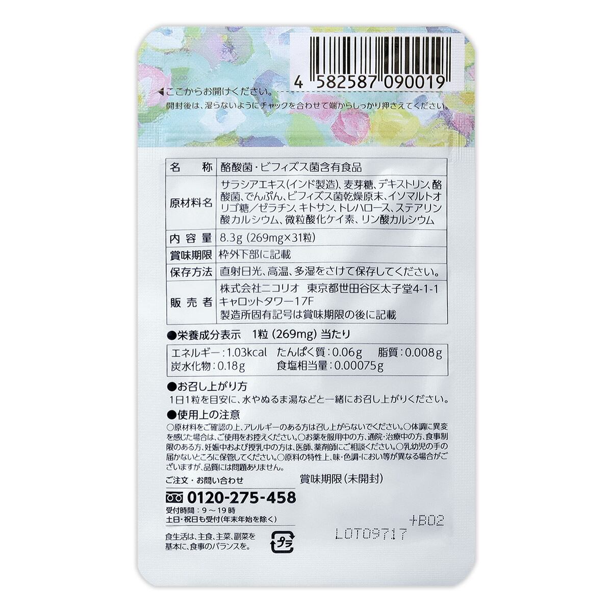 サラシアエキス(インド製造)、麦芽糖、デキストリン、酪酸菌、澱粉、ビフィズス菌乾燥原末、イソマルトオリゴ糖/ゼラチン、キトサン、トレハロース、ステアリン酸カルシウム、微粒酸化ケイ素、リン酸カルシウム
