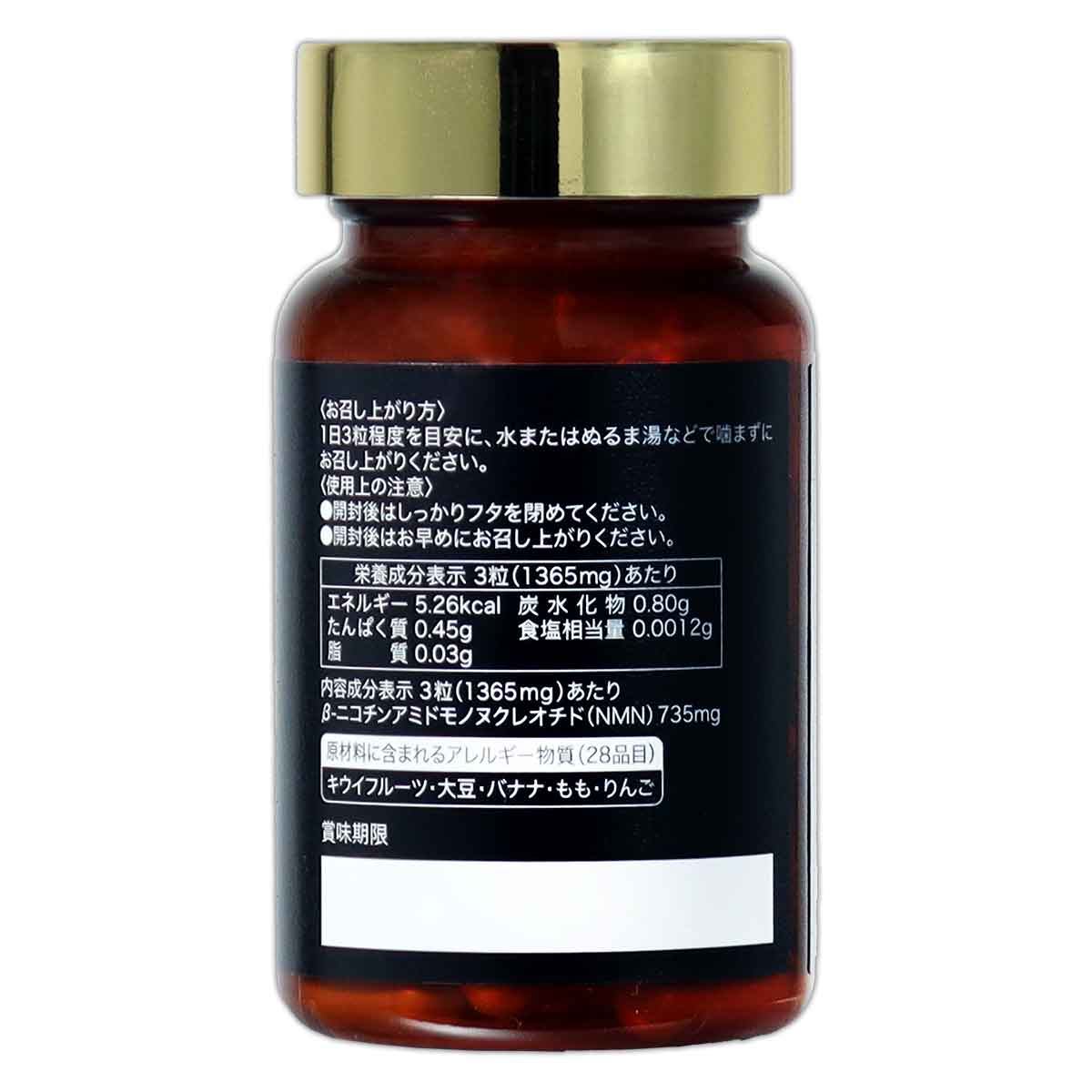 β-ニコチンアミドモノヌクレオチド(国内製造)、ビタミンE含有植物油、植物発酵エキス末(キウイフルーツ・大豆・バナナ・もも・りんごを含む)、レスベラトロール含有赤ワインエキス末、コエンザイムQ10、エキナセアエキス末、キダチアロエ葉エキス末、乾燥ローヤルゼリー、α-リポ酸、クロレラ粉末/セルロース、HPMC、ステアリン酸Ca、ナイアシン、微粒酸化ケイ素、増粘剤(ジェランガム)、L-トリプトファン、V.C、V.E、パントテン酸Ca、V.B1、V.B6、V.A、V.B2、葉酸、V.D、V.B12