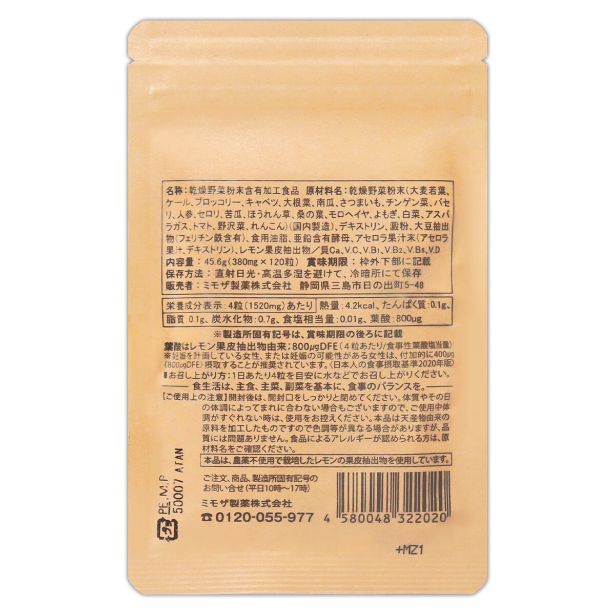 乾燥野菜粉末(大麦若葉、ケール、ブロッコリー、キャベツ、大根葉、南瓜、さつまいも(アヤムラサキ)、チンゲン菜、パセリ、人参、セロリ、苦瓜、ほうれん草、桑の葉、モロヘイヤ、よもぎ、白菜、アスパラガス、トマト、野沢菜、れんこん)(国内製造)、デキストリン、澱粉、大豆抽出物(フェリチン鉄含有)、食用油脂、亜鉛含有酵母、アセロラ果汁末(アセロラ果汁、デキストリン)レモン果皮抽出物/貝Ca、V.C、V.B1、V.B2、V.B6、VD
