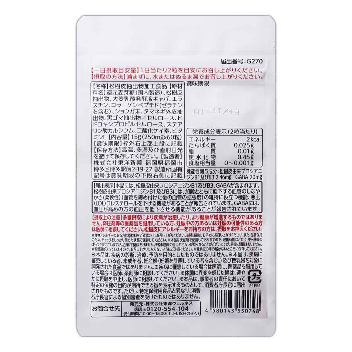 本品には、松樹皮由来プロシアニジンB1及びB3、GABAが含まれます。松樹皮由来プロシアニジンB1及びB3には、加齢とともに低下する血管のしなやかさ(柔軟性)(血管を締め付けた後の血管の拡張度)の維持に役立つ機能、悪玉(LDL)コレステロールを下げる機能があることが報告されています。GABAには、血圧が高めの方の血圧を低下させる機能があることが報告されています。