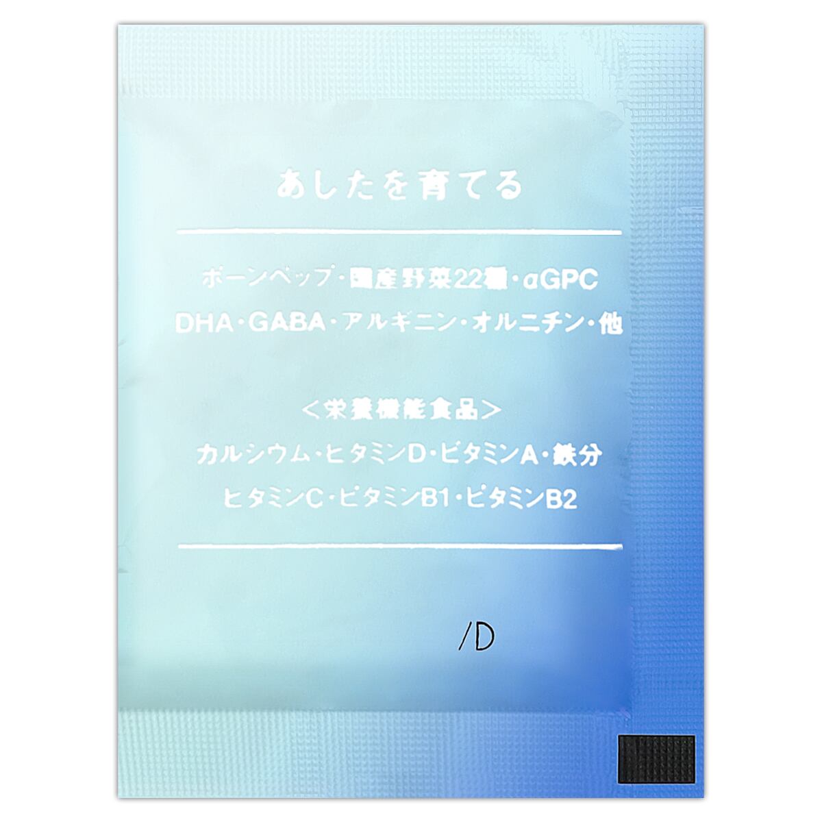 粉末還元麦芽糖水飴(国内製造)、食用焼成魚骨粉、クリーミングパウダー(デキストリン、植物油脂、乳糖、脱脂粉乳)、国産野菜ミックス(オクラ末、キャベツ末、ケール末、ニンジン末、カボチャ末、ゴボウの根末、紫イモ末、サトイモ末、シイタケ末、ブロッコリー末、アシタバ末、アスパラガス末、枝豆(大豆)末、コマツナ末、セロリ末、ダイコン末、ダイコン葉末、タマネギ末、パセリ末、ホウレンソウ末、レモン末、レンコン末)、ギャバ含有乳酸菌醗酵エキス、ラフマ葉抽出物、L-オルニチン塩酸塩、L-シトルリン、卵黄ペプチド、α-GPC加工食品、DHA 粉末/結晶セルロース、ステアリン酸Ca、香料、ビタミンC、クエン酸、微粒酸化ケイ素、甘味料(ステビア)、抽出ビタミンE、ナイアシン、ピロリン酸第二鉄、カゼインナトリウム、pH調整剤、乳化剤、ビタミンA、L-アルギニン、酸化マグネシウム、セルロース、ビタミンD、ビタミンB2、ビタミンB1、ビタミンB6、酸化防止剤(ビタミンE)、葉酸、キサンタンガム、ビタミンB12、(一部に乳成分・卵・大豆を含む)