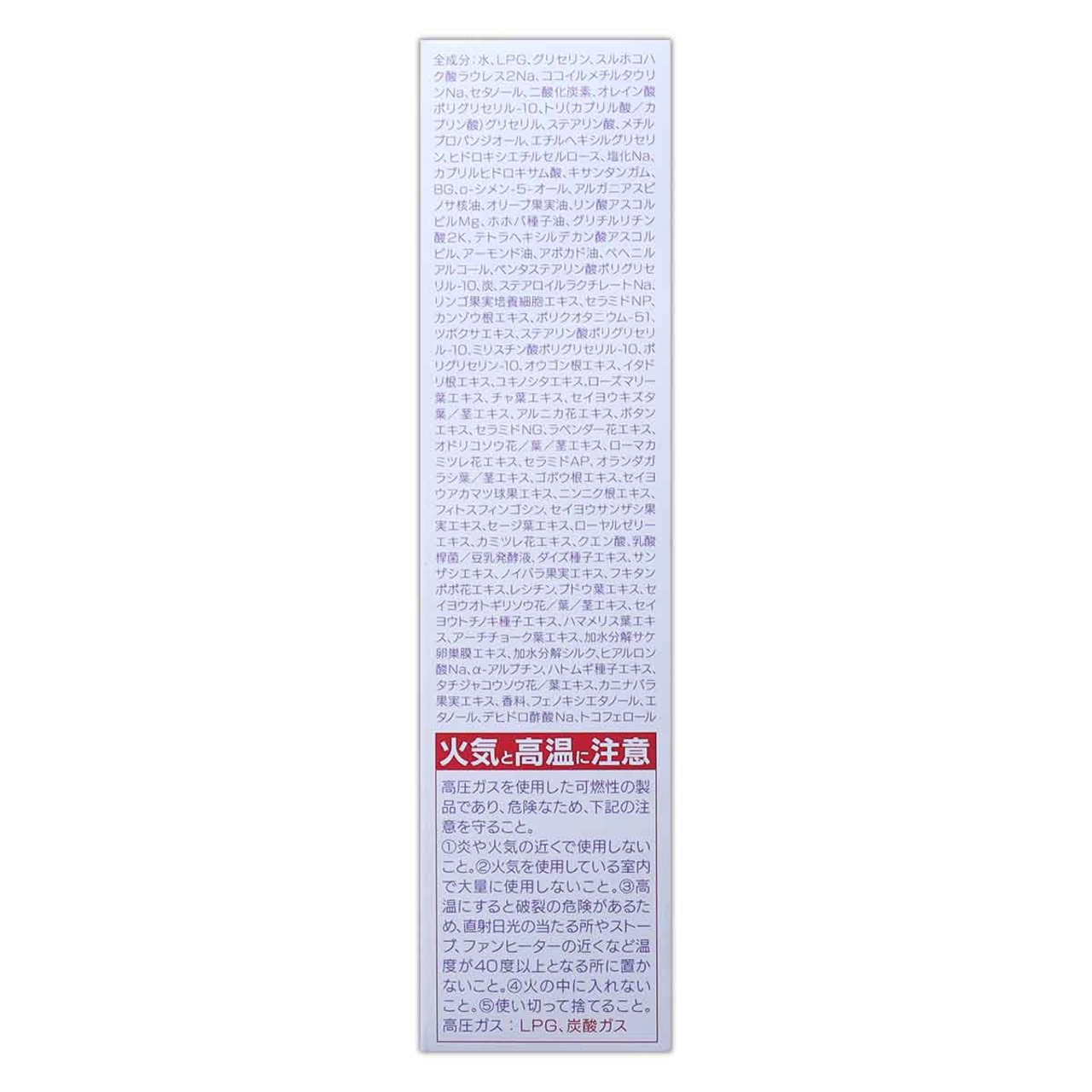 水、LPG、グリセリン、スルホコハク酸ラウレス2Na、ココイルメチルタウリンNa、セタノール、二酸化炭素、フェノキシエタノール、オレイン酸ポリグリセリル-10、トリ(カプリル酸/カプリン酸)グリセリル、ステアリン酸、メチルプロパンジオール、エチルヘキシルグリセリン、ヒドロキシエチルセルロース、塩化Na、カプリルヒドロキサム酸、キサンタンガム、BG、o-シメン-5-オール、アルガニアスピノサ核油、オリーブ果実油、リン酸アスコルビルMg、ホホバ種子油、グリチルリチン酸2K、テトラヘキシルデカン酸アスコルビル、アーモンド油、アボカド油、ベヘニルアルコール、エタノール、ペンタステアリン酸ポリグリセリル-10、炭、ステアロイルラクチレートNa、リンゴ果実培養細胞エキス、セラミドNP、カンゾウ根エキス、ポリクオタニウムー51、ツボクサエキス、ステアリン酸ポリグリセリル-10、ミリスチン酸ポリグリセリル-10、ポリグリセリン-10、オウゴン根エキス、イタドリ根エキス、ユキノシタエキス、ローズマリー葉エキス、チャ葉エキス、セイヨウキズタ葉/茎エキス、アルニカ花エキス、ボタンエキス、セラミドNG、ラベンダー花エキス、オドリコソウ花/葉/茎エキス、ローマカミツレ花エキス、セラミドAP、オランダガラシ葉/茎エキス、ゴボウ根エキス、セイヨウアカマツ球果エキス、ニンニク根エキス、フィトスフィンゴシン、セイヨウサンザシ果実エキス、セージ葉エキス、ローヤルゼリーエキス、カミツレ花エキス、デヒドロ酢酸Na、クエン酸、乳酸桿菌/豆乳発酵液、ダイズ種子エキス、サンザシエキス、ノイバラ果実エキス、フキタンポポ花エキス、レシチン、ブドウ葉エキス、セイヨウオトギリソウ花/葉/茎エキス、セイヨウトチノキ種子エキス、ハマメリス葉エキス、アーチチョーク葉エキス、加水分解サケ卵巣膜エキス、加水分解シルク、ヒアルロン酸Na、α-アルブチン、ハトムギ種子エキス、タチジャコウソウ花/葉エキス、カニナバラ果実エキス、香料、トコフェロール