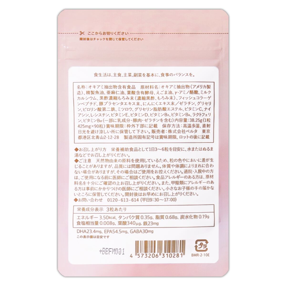 オキアミ抽出物(アメリカ製造)、精製魚油、亜麻仁油、葉酸含有酵母、えごま油、γ-アミノ酪酸、ミルクカルシウム、黒酢濃縮もろみ末(濃縮黒酢、もろみ末)、フィッシュコラーゲンペプチド、豚プラセンタエキス末、にんにくエキス末/ゼラチン、グリセリン、ピロリン酸第二鉄、ミツロウ、グリセリン脂肪酸エステル、ビタミンC、ナイアシン、L-シスチン、ビタミンE、ビタミンD、ビタミンB2、ビタミンB6、ラクトフェリン、ビタミンB12(一部に乳・豚肉・ゼラチンを含む)