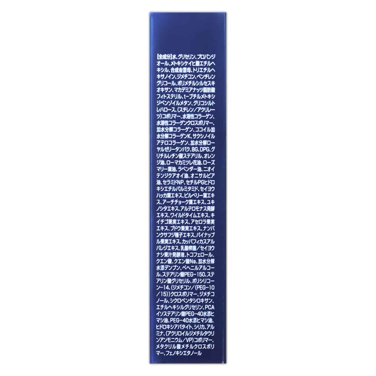 水、グリセリン、プロパンジオール、メトキシケイヒ酸エチルヘキシル、合成金雲母、トリエチルヘキサノイン、ジメチコン、ペンチレングリコール、ポリメチルシルセスキオキサン、マカデミアナッツ脂肪酸フィトステリル、t-ブチルメトキシジベンゾイルメタン、グリコシルトレハロース、(スチレン/アクリレーツ)コポリマー、水溶性コラーゲン、水溶性コラーゲンクロスポリマー、加水分解コラーゲン、ココイル加水分解コラーゲンK、サクシノイルアテロコラーゲン、加水分解ローヤルゼリータンパク、BG、DPG、グリチルレチン酸ステアリル、オレンジ油、ローマカミツレ花油、ローズマリー葉油、ラベンダー油、ニオイテンジクアオイ油、オニサルビア油、セラミドNP、セチルPGヒドロキシエチルパルミタミド、セイヨウハッカ葉エキス、ビルベリー葉エキス、アーチチョーク葉エキス、ユキノシタエキス、アルテロモナス発酵エキス、ワイルドタイムエキス、キイチゴ果実エキス、アセロラ果実エキス、ブドウ果実エキス、ナンバンクサフジ種子エキス、パイナップル果実エキス、カッパフィカスアルバレジエキス、乳酸桿菌/セイヨウナシ果汁発酵液、トコフェロール、クエン酸、クエン酸Na、加水分解水添デンプン、ベヘニルアルコール、ステアリン酸PEG-150、ステアリン酸グリセリル、ポリシリコーン-14、(ジメチコン/(PEG-10/15))クロスポリマー、ジメチコノール、シクロペンタシロキサン、エチルヘキシルグリセリン、PCAイソステアリン酸PEG-40水添ヒマシ油、PEG-40水添ヒマシ油、ヒドロキシアパタイト、シリカ、アルミナ、(アクリロイルジメチルタウリンアンモニウム/VP)コポリマー、メタクリル酸メチルクロスポリマー、フェノキシエタノール