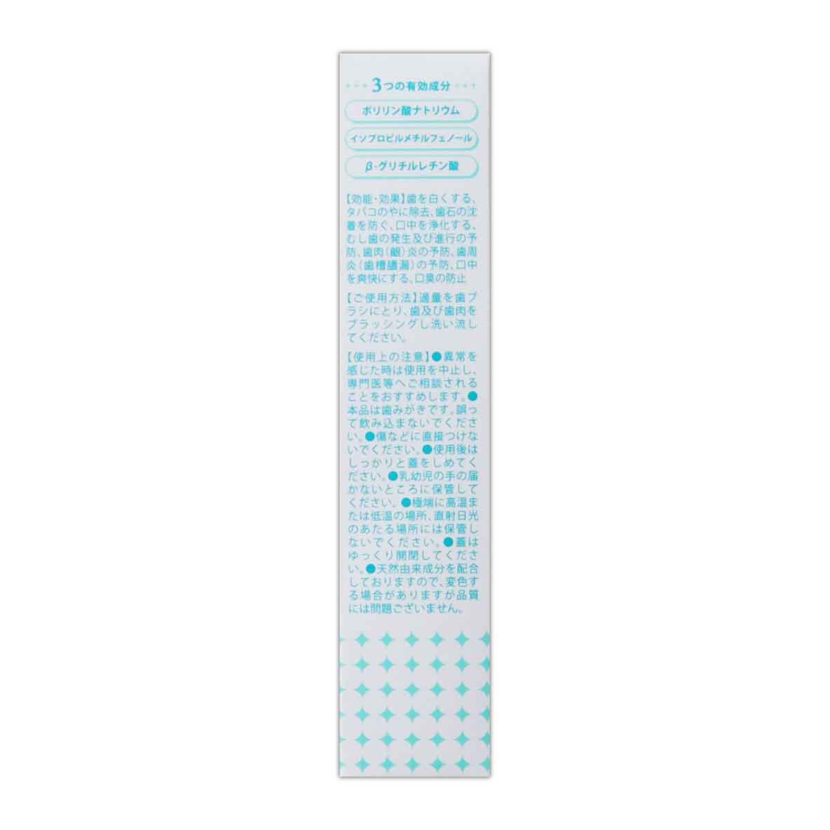 お口のケアに必要な「ポリリン酸ナトリウム」「イソプロピルメチルフェノール」「β-グリチルレチン酸」などの成分が汚れを浮かせて除去し、さらに口臭予防や口内に潜む菌の増殖を抑えることで、美しい歯へ導きます。