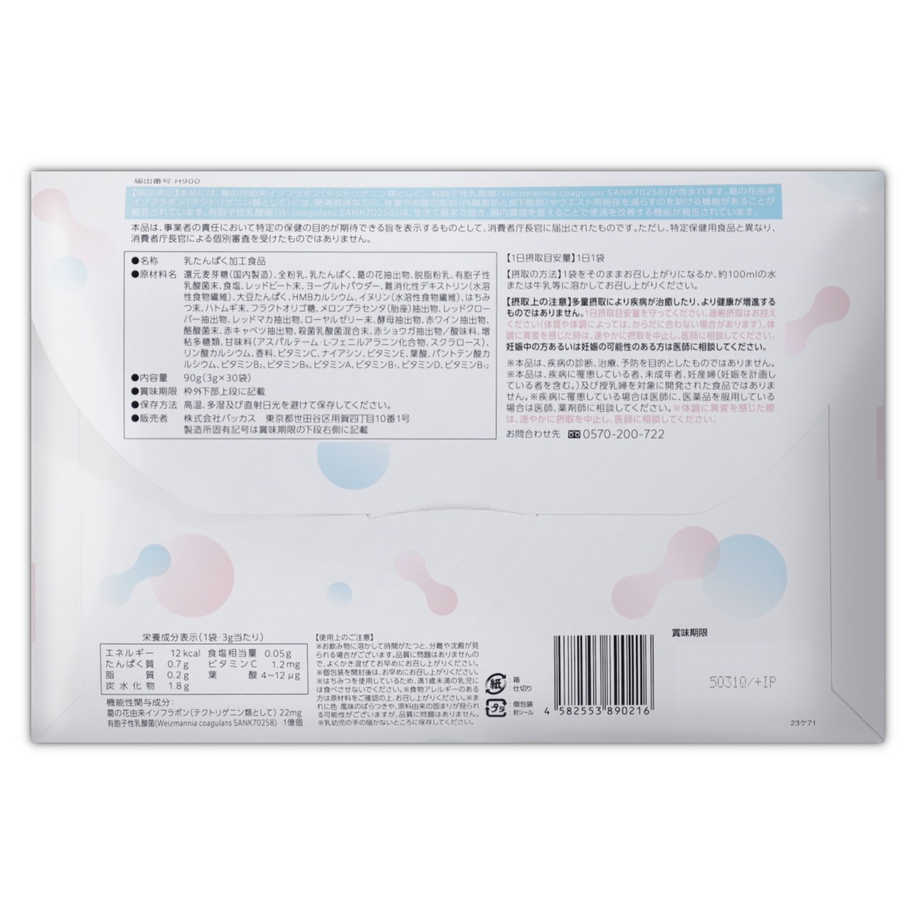 本品には、葛の花由来イソフラボン(テクトリゲニン類として)、有胞子性乳酸菌(Weizmannia coagulans SANK70258)が含まれます。葛の花由来イソフラボン(テクトリゲニン類として)には、肥満気味な方の、体重やお腹の脂肪(内臓脂肪と皮下脂肪)やウエスト周囲経を減らすのを助ける機能があることが報告されています。有胞子性乳酸菌(Weizmannia coagulans SANK70258)は、生きて腸まで届き、腸内環境を整えることで便通を改善する機能が報告されています。